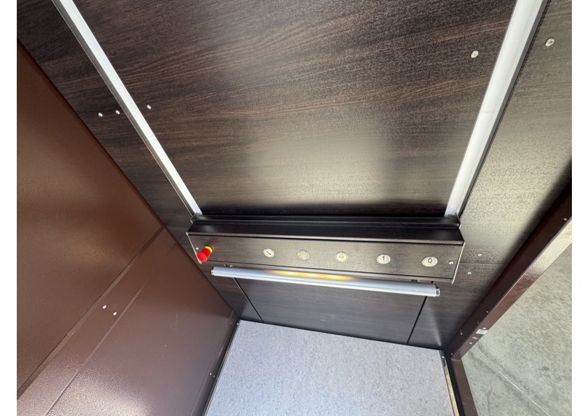 dans la structure vitrée autoportante le plateau toute sécurité entre les parois lisses. Le portillon sur le palier haut permet l’installation lorsque la hauteur sous plafond est réduite à 2,00m.